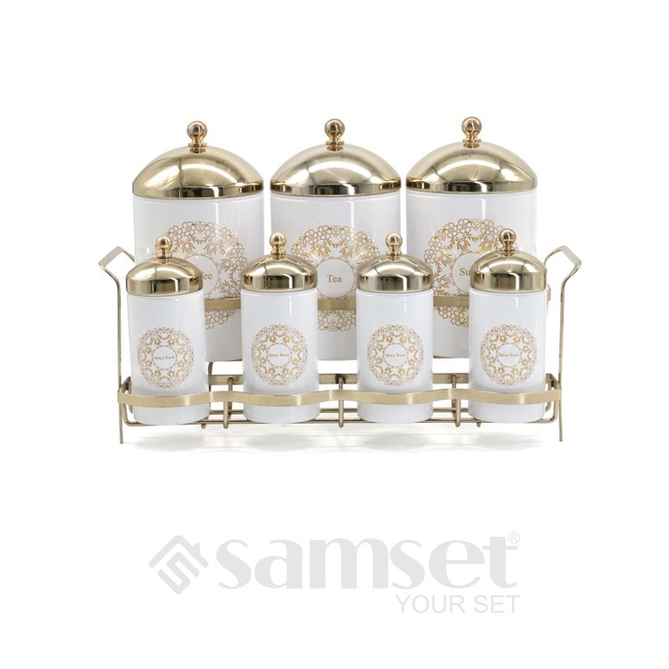 این محصول شامل ۳ بانکه بزرگ برای نگهداری چای، قند، شکر و ۴ بانکه کوچک برای نگهداری ادویه می باشد سایز بانکه بزرگ : ۱۲x۱۲x۲۰ و سایز بانکه کوچک : ۷x۷x۱۶ می باشد. توصیه می شود برای حفظ رنگ طلایی درب محفظه ها، برای شستشو از مواد شوینده غیر استاندارد (وایتکس) استفاده نشود و با ابر و مایع تمیز شود و بعد از شستشو با پارچه نرم خشک شود.