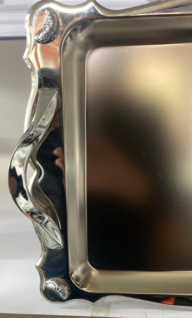 بدنه این سینی از فلز با کیفیت بالا با آبکاری براق ساخته شده است که مانند آینه نور را منعکس میکند. لبههای کنگرهدار و منحنی سینی، تضاد زیبایی با فرم مستطیل آن ایجاد کرده و به آن هویتی کلاسیک-مدرن بخشیده است. دستههای کشیده و صیقلی این مدل، نه تنها مکمل زیبایی آن هستند، بلکه با طراحی ارگونومیک خود، جابهجایی ظروف را بسیار ایمن و راحت میسازند.