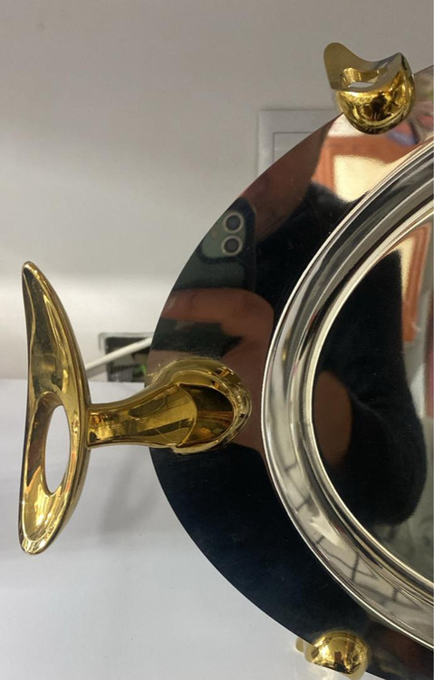 ترکیب رنگ لوکس: بدنه استیل با جلای آینهای (نقرهای) در کنار دستهها و پایههای طلایی، هارمونی بینظیری ایجاد کرده که با هر نوع ظروف پذیرایی (کریستال، چینی یا سرامیک) به زیبایی ست میشود.