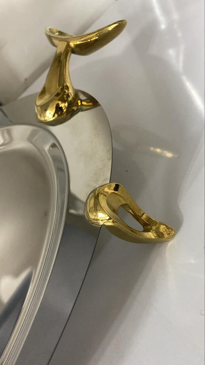 اگر به دنبال قطعهای هستید که میز پذیرایی شما را از یک میزبانی ساده به یک ضیافت شاهانه تبدیل کند، سینی بیضی سانیکس انتخابی بیرقیب است. این محصول با طراحی مدرن و در عین حال اصیل خود، ترکیبی خیرهکننده از تضاد رنگهای نقرهای و طلایی را به نمایش میگذارد که نگاه هر بینندهای را در همان لحظه اول به خود خیره میکند.