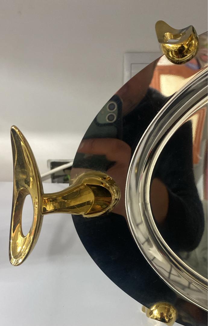 اگر به دنبال قطعهای هستید که میز پذیرایی شما را از یک میزبانی ساده به یک ضیافت شاهانه تبدیل کند، سینی بیضی سانیکس انتخابی بیرقیب است. این محصول با طراحی مدرن و در عین حال اصیل خود، ترکیبی خیرهکننده از تضاد رنگهای نقرهای و طلایی را به نمایش میگذارد که نگاه هر بینندهای را در همان لحظه اول به خود خیره میکند.